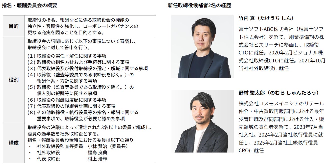 また、事業成長の加速に向けた経営体制の強化を目的に、指名・報酬委員会の審議を経て、新任取締役候補者2名を選任しました。両名が早期に取締役として能力を発揮することが株主価値の最大化に資すると判断し、その選任に関して、2025年5月7日開催予定の臨時株主総会に上程する予定です。