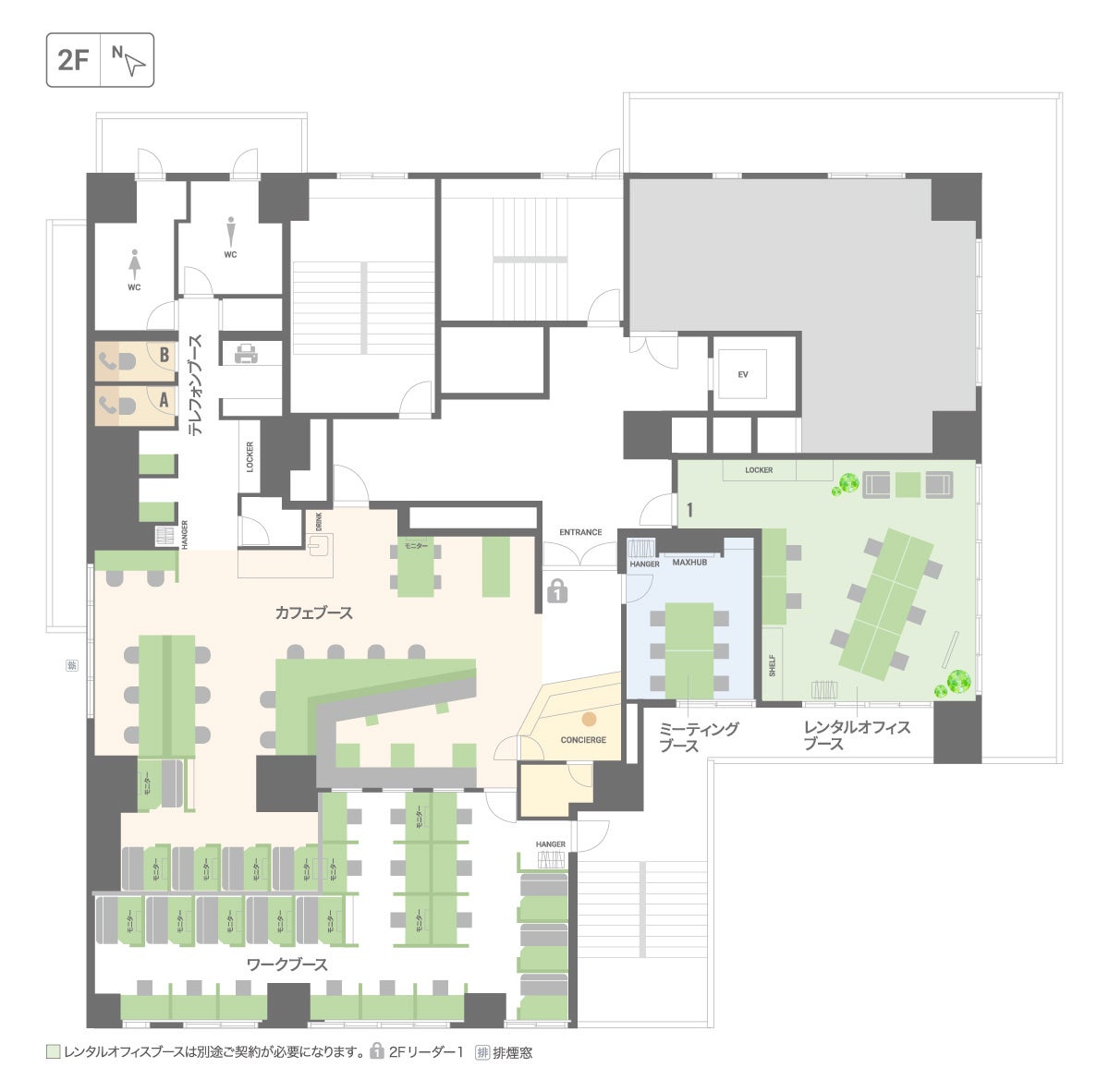 設備:Wi-Fi、フリードリンク、無料プリンター、ロッカー、ポスト、登記可、会議室、WEB会議用個室、コンシェルジュ