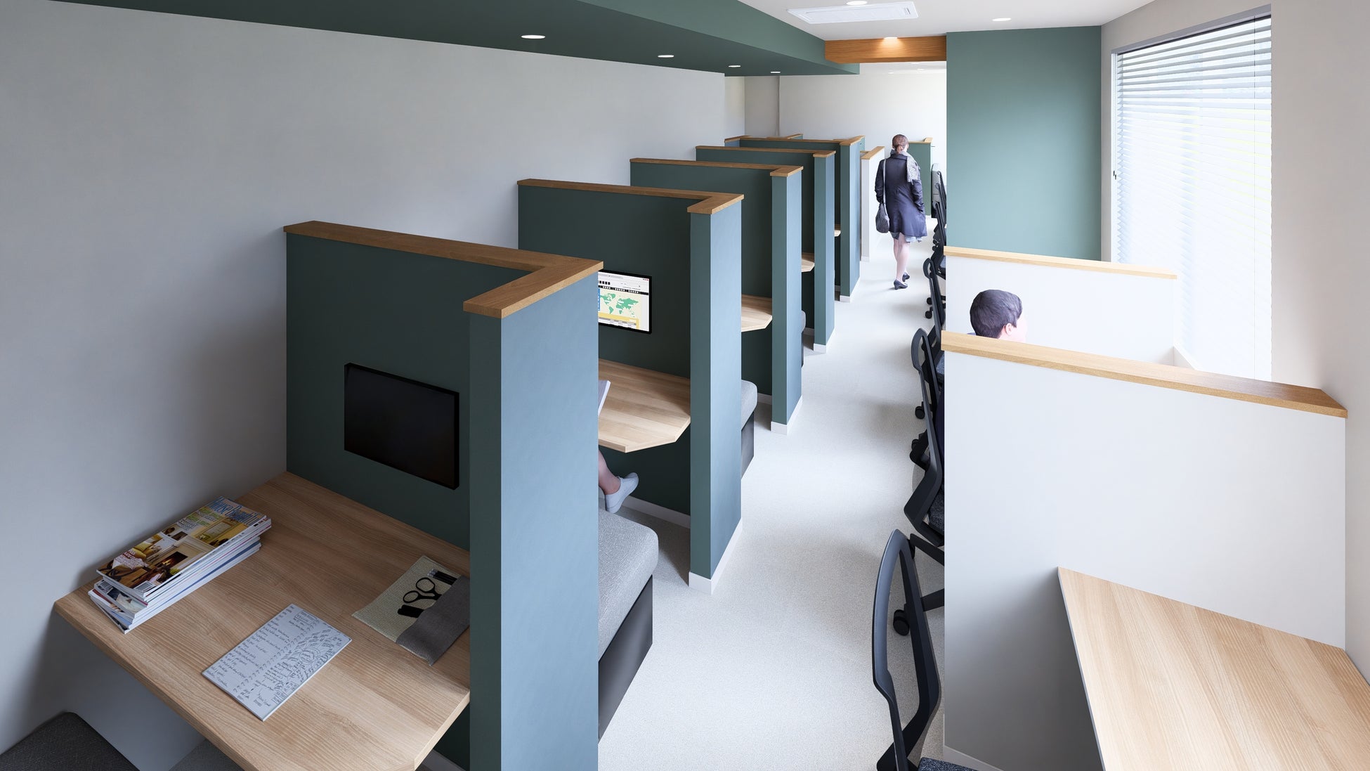 当施設は、横須賀中央駅と閑静な住宅街の中間にあるため、朝から活動したい方や、帰宅前に集中して作業を進めたい方にとって、理想的なロケーションです。全席にプライバシーを確保する間仕切りが設けられたワークブースや、オープンなカフェブースは、アイデアの共有やコミュニケーションを活性化する設計となっています。利用目的に合わせたゾーニングにより、ビジネスシーンから自習、資格取得のための勉強まで、あらゆるニーズに応える快適なワークスペースを実現しています。