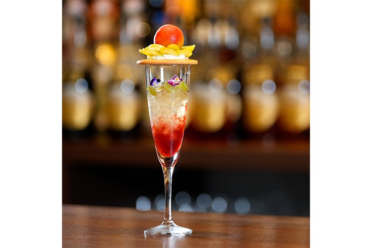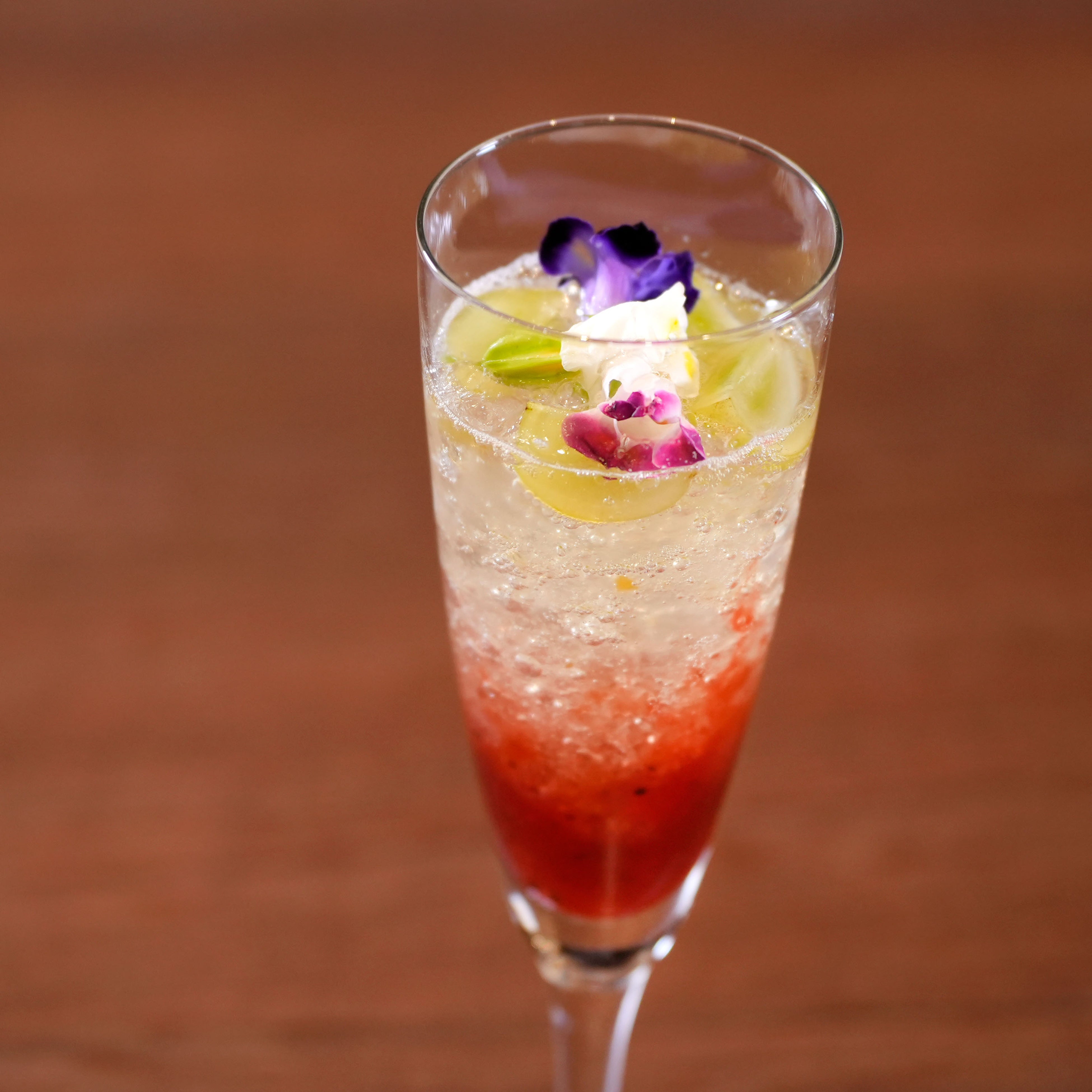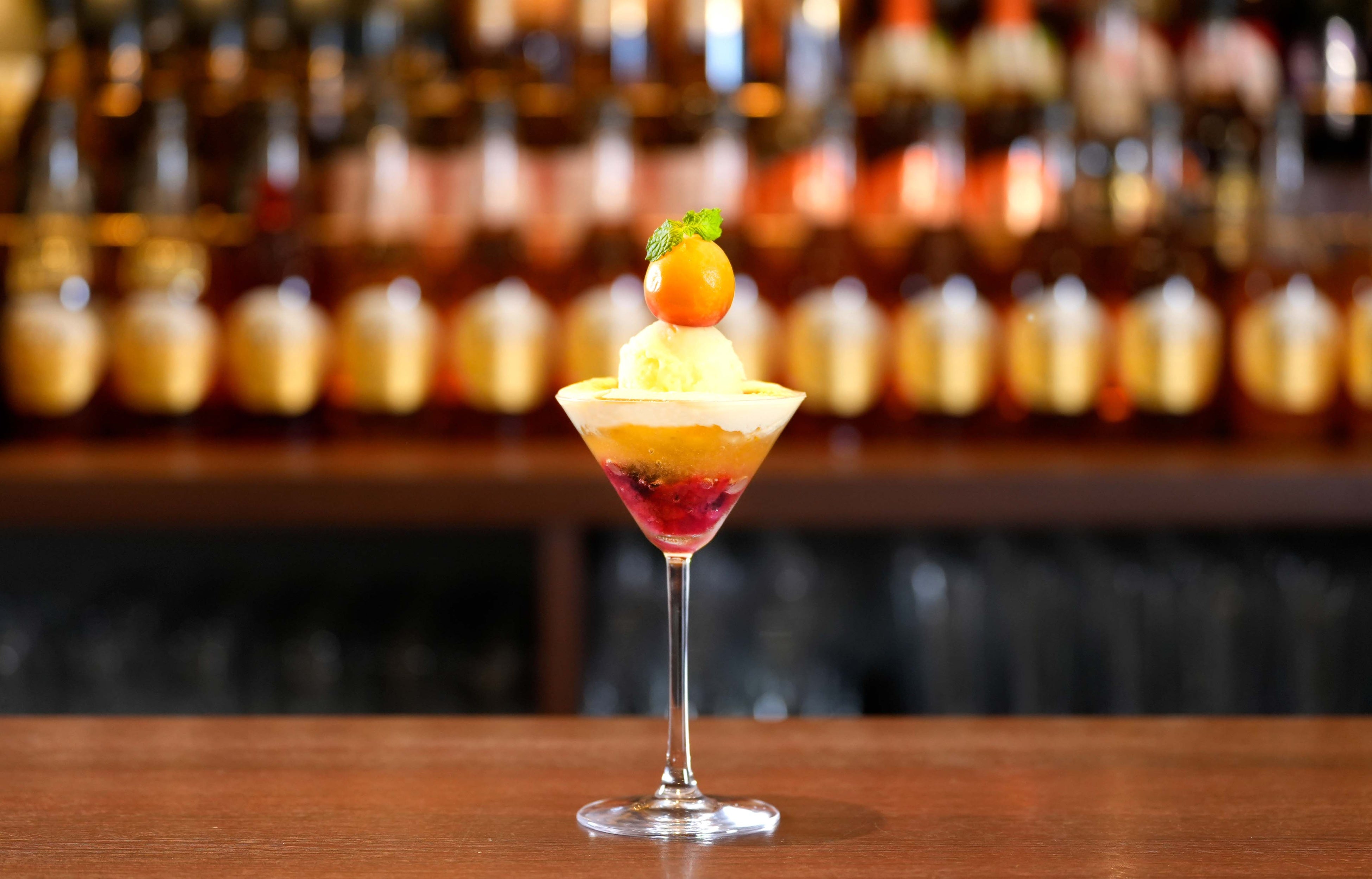 「梅マスカットロワイヤル」は、梅とイチゴのシロップ層にシャインマスカットとエディブルフラワーとミントを飾った梅ジュレ層を重ね、ガレットで蓋をしシャインマスカットとフローズン完熟梅をトッピングしました。仕上げにバーテンダーが梅酒のスパークリングワインを注ぐ事で華やかなロゼカラーで爽やかな口当たりのカクテルパフェに仕上がります。
