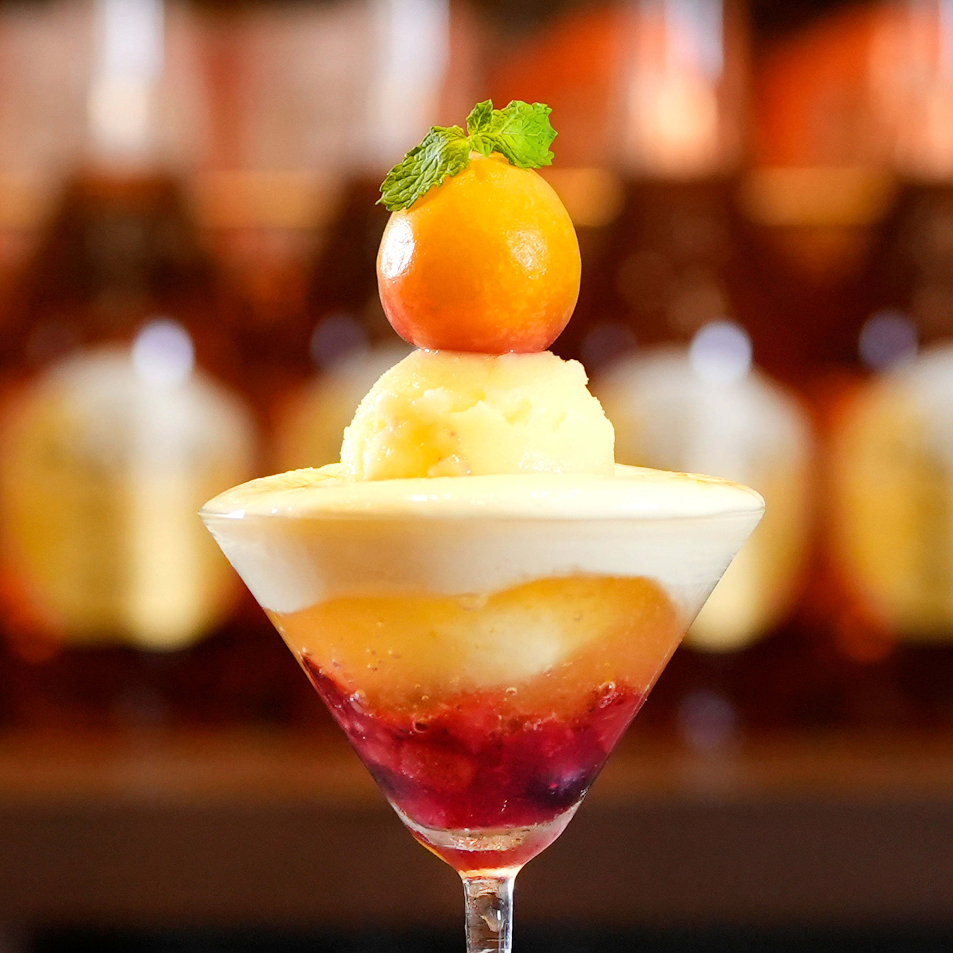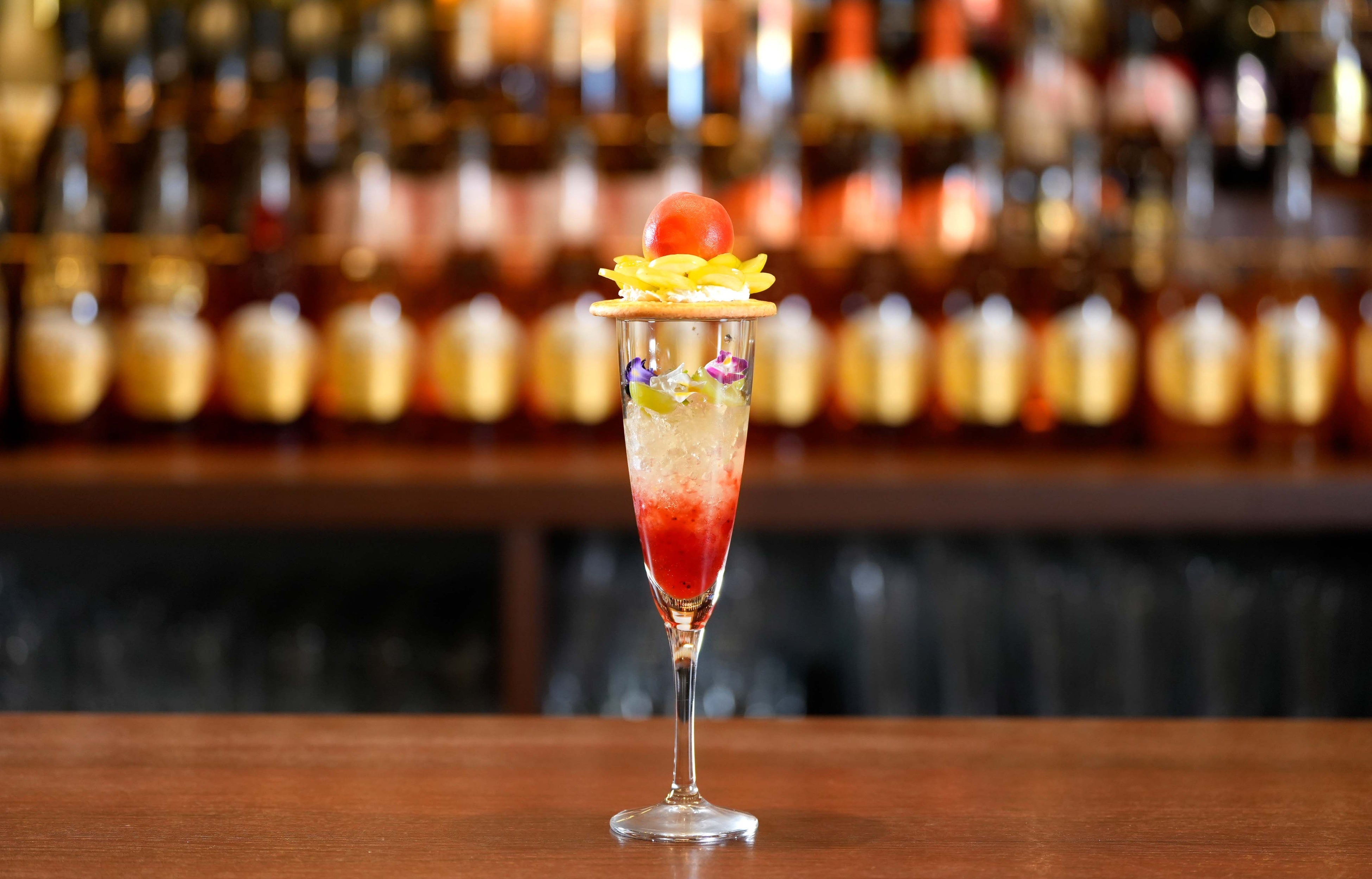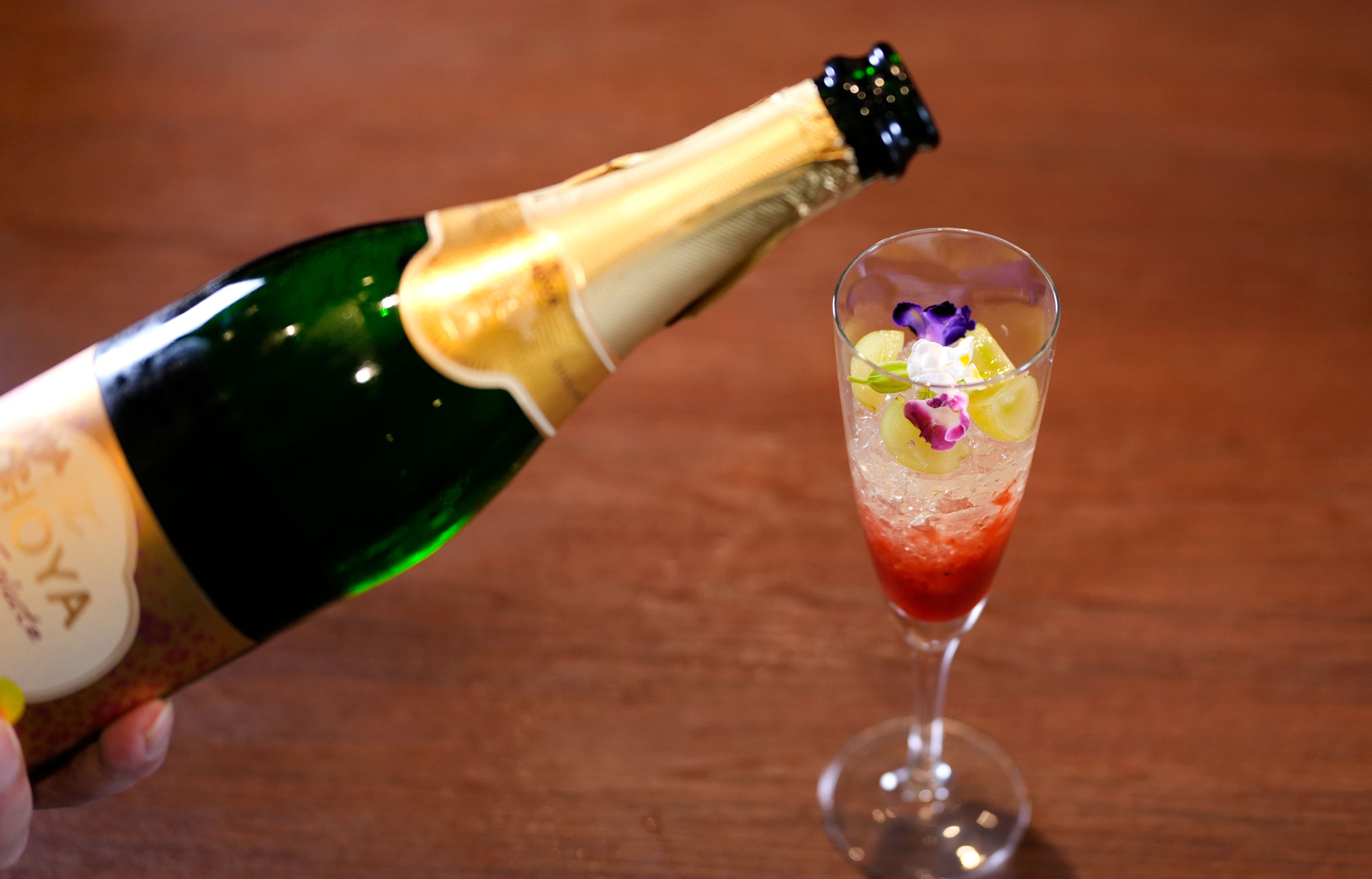 「梅マスカットロワイヤル」は、梅とイチゴのシロップ層にシャインマスカットとエディブルフラワーとミントを飾った梅ジュレ層を重ね、ガレットで蓋をしシャインマスカットとフローズン完熟梅をトッピングしました。仕上げにバーテンダーが梅酒のスパークリングワインを注ぐ事で華やかなロゼカラーで爽やかな口当たりのカクテルパフェに仕上がります。
