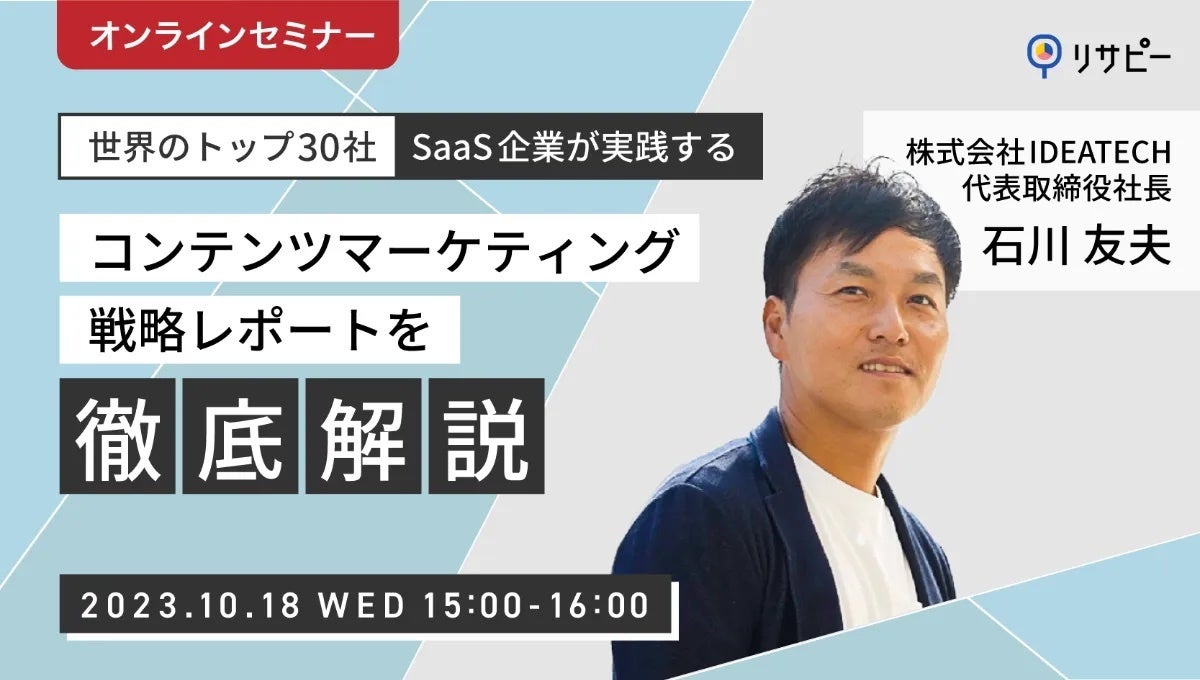 【独自調査】世界のトップ30社SaaS企業が実践するコンテンツマーケティング戦略レポートを徹底解説セミナー:https://ideatech.jp/seminar/231018/?utm_source=pr231003