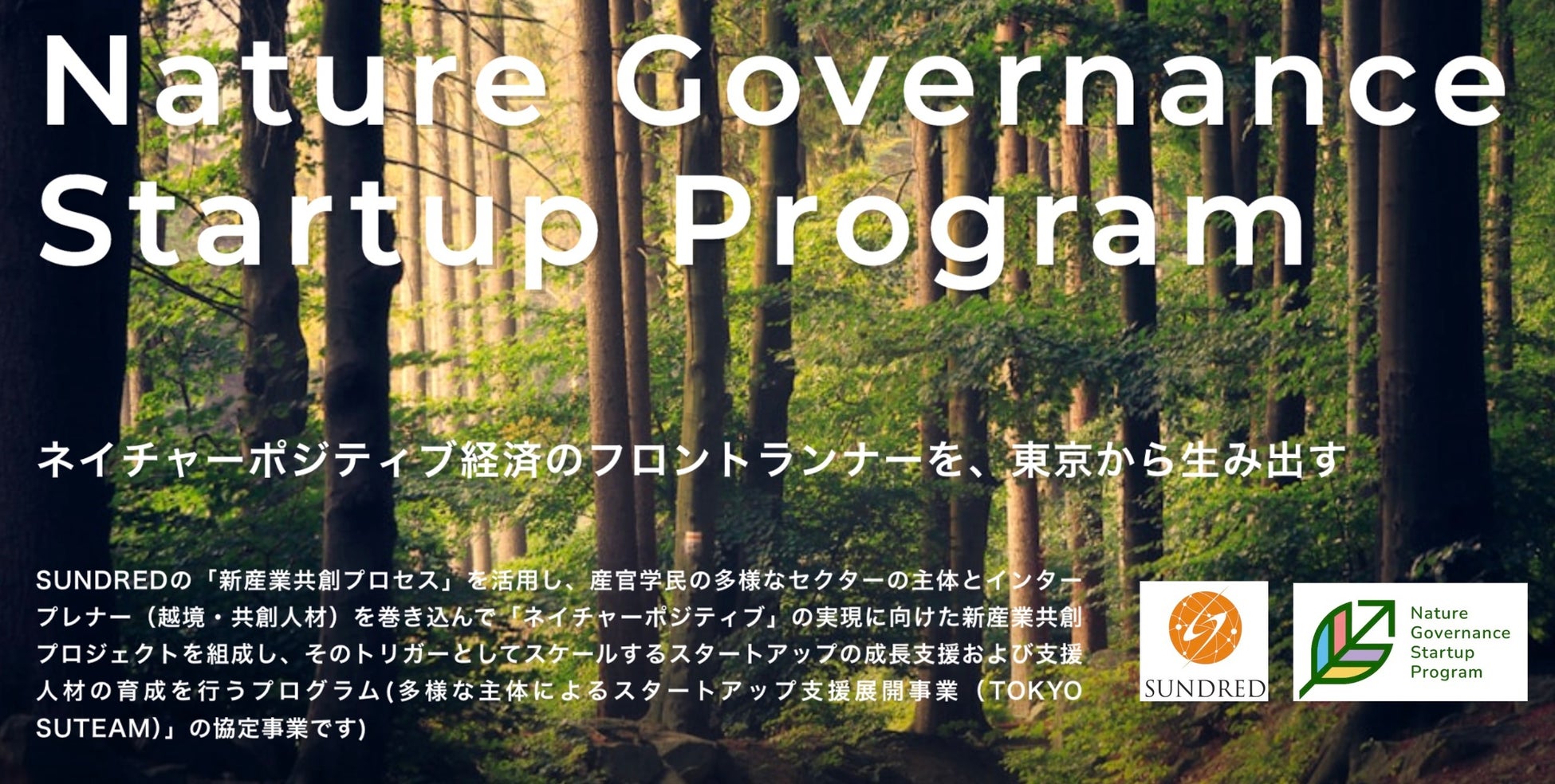 100個の新産業の共創を目指す「新産業のエコシステムビルダー」SUNDRED株式会社(所在地:東京都渋谷区、代表取締役:留目 真伸、以下:SUNDRED)は、東京都が推進するスタートアップ支援事業「多様な主体によるスタートアップ支援展開事業(TOKYO SUTEAM)」に2023年度に続き協定事業者として採択されました。SUNDREDの「新産業共創プロセス」を活用し、産官学民の多様なセクターの主体とインタープレナー(越境・共創人材)を巻き込んで「ネイチャーポジティブ」の実現に向けた新産業共創プロジェクトを組成し、そのトリガーとしてスケールするスタートアップの成長支援および支援人材の育成プログラム「Nature Governance Startup Program」を実施するにあたり、スタートアップ及び支援人材の育成対象者の募集を開始します。