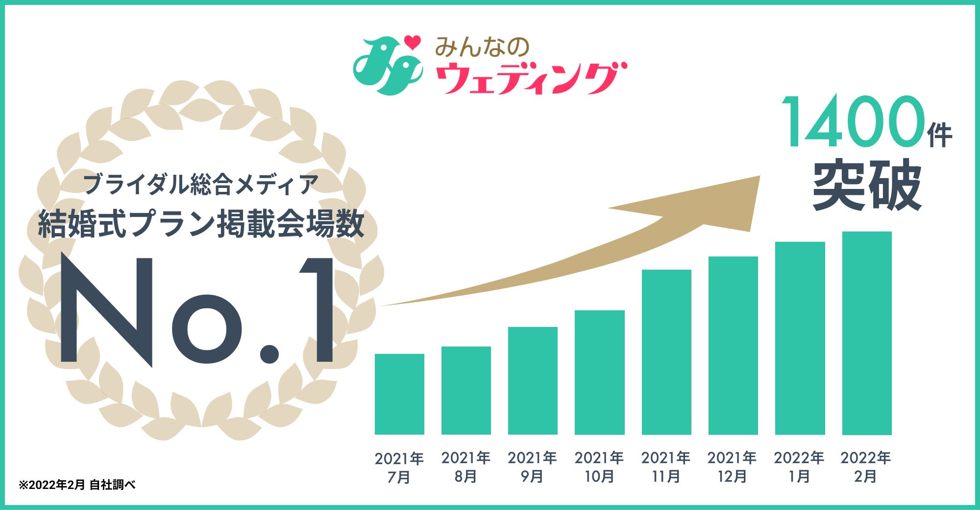 『みんなのウェディング』の結婚式プラン掲載会場数が増加、ブライダル総合メディアでNo.1※ に!