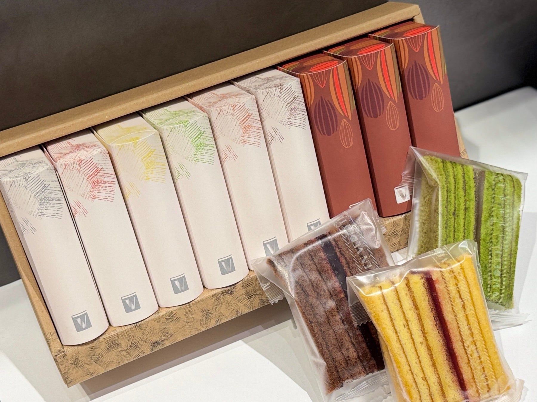 アーモンドのコク、バター香るしっとりとした食感のバウムクーヘンに色彩鮮やかな甘酸っぱい香りのパートドフリュイを合わせました。さらに、ショコラ生地に濃厚なガナッシュをサンドしたバウムクーヘンを詰め合わせた季節限定のギフトです。