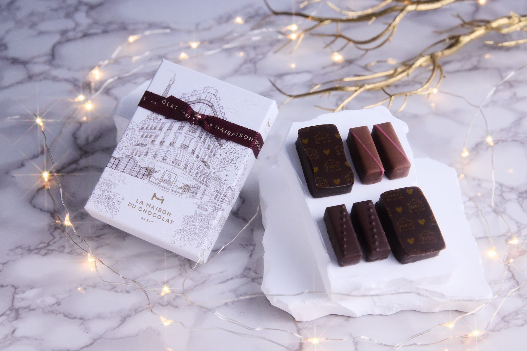 異なる3つの産地のカカオを使用したダークガナッシュ、ルバーブを使用したガナッシュ、バニラ&ペッパーのプラリネのブシェ、新作3種を2026年バレンタイン限定デザインのボックスに詰め合わせました。