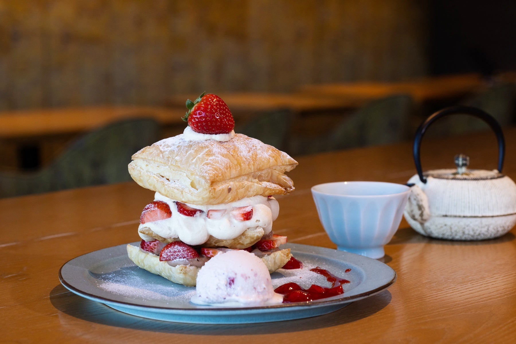静岡県産の和紅茶を使用したミルクティークリームと、ほんのりビターなチョコレートクリームをサクサクのパイでサンドした、見た目も華やかな贅沢ミルフィーユ。自家製の苺ミルクアイス、甘酸っぱいあまおうソースとともに、さまざまな組み合わせでお楽しみください。