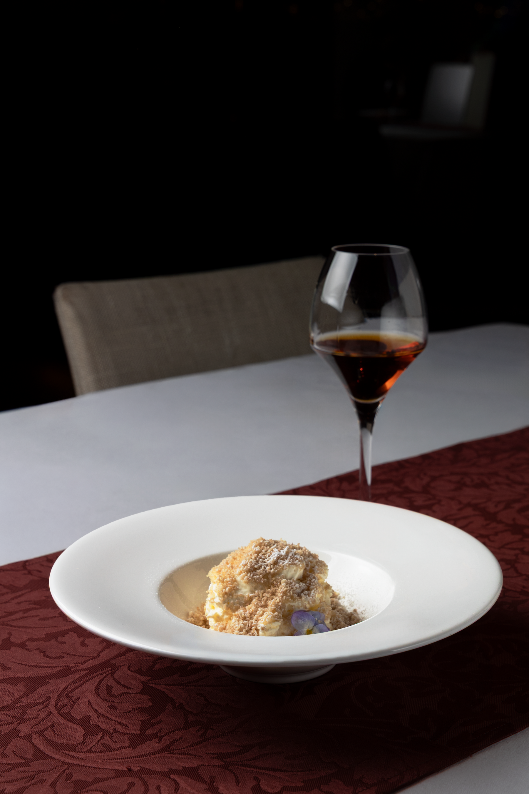 サクサク食感を楽しめるコーヒー風味のメリンガータを加えました。熟成したマルサラやヴィン・サントなどのデザートワインとの