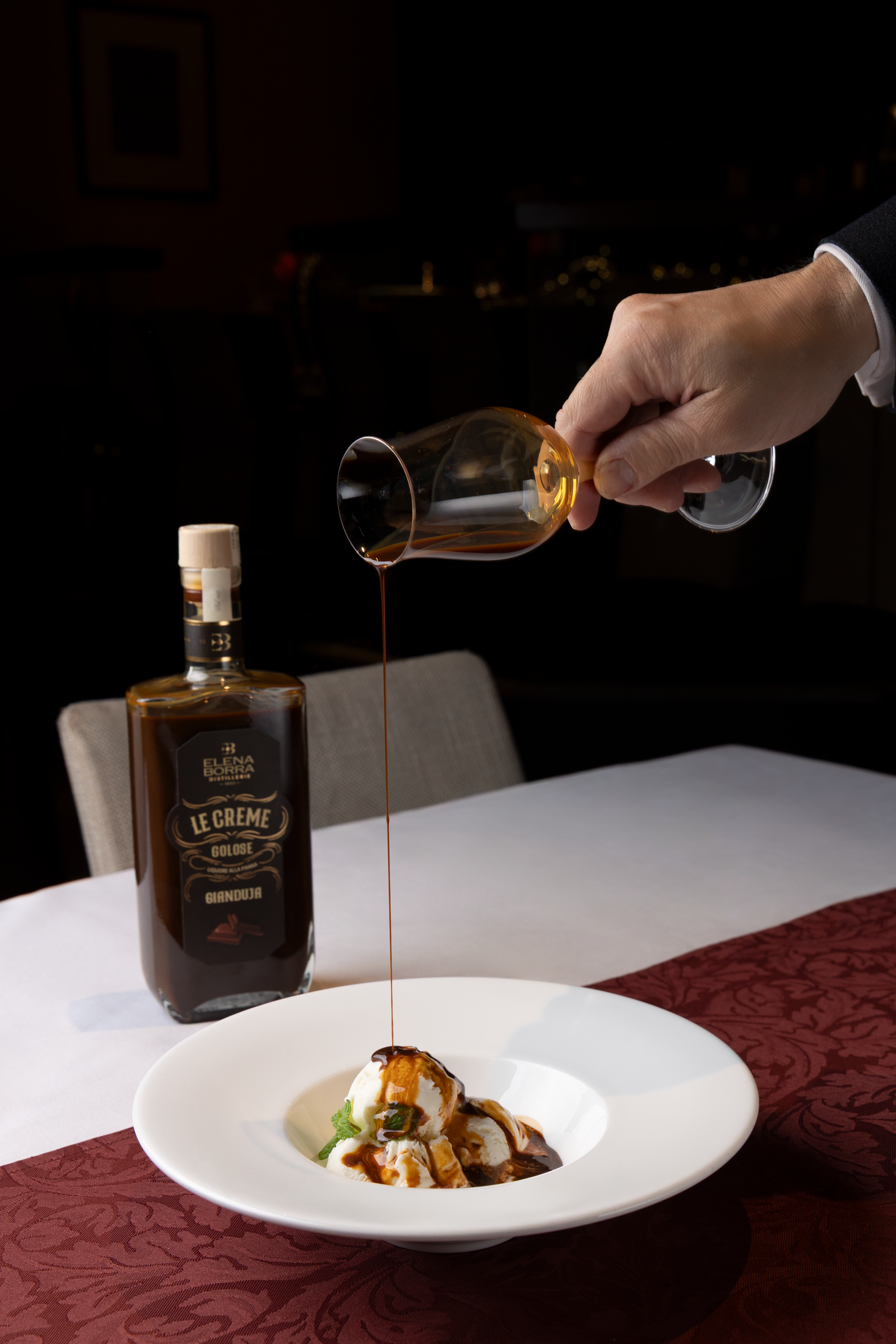 芳醇な風味に仕立てたソースを冷たいジェラートにまとわせる大人のドルチェ。ナッツのコクとリキュールの華やかな香りが重なり、