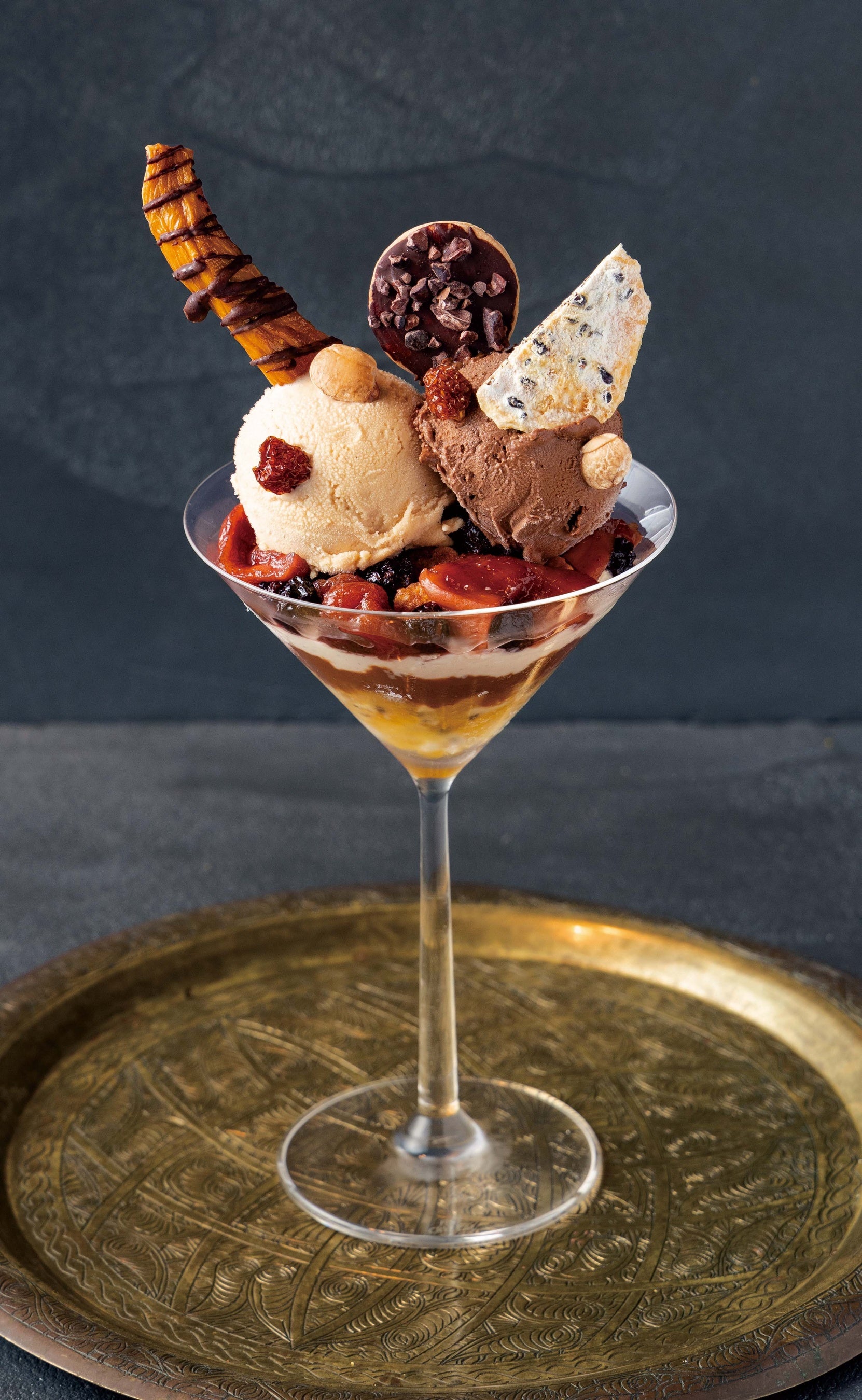 アステカの皇帝を魅了したカカオとバニラ。カカオとヘーゼルナッツのペーストで作るチョコレート菓子ジャンドゥーヤと、バニラの濃密ジェラートに、パッションフルーツジュレ、バニラムース、カカオソース、マンゴーのコンポートを重ねました。アンデスの多彩な果実を味わうパフェです。