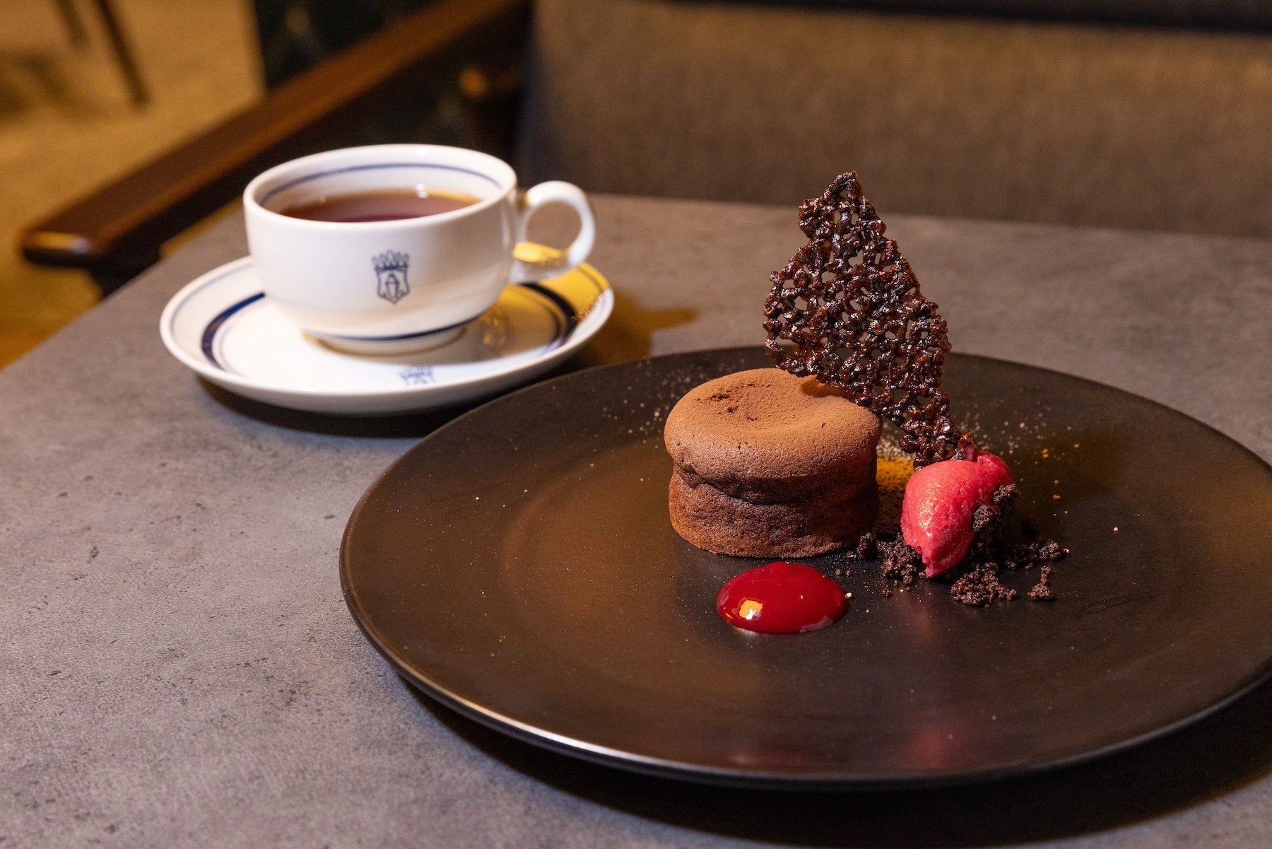 毎日のご褒美に、ちょっと贅沢なフォンダンショコラ。甘くとろけるチョコレートに甘酸っぱいフランボワーズソルベを添えました。ほろ苦いカカオニブのチュイールと一緒に食べると絶品です。頑張るあなたに、至福の時間をご提供いたします。