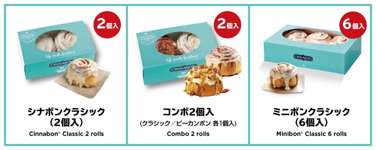 今回は、定番の「シナボンクラシック」「ミニボンクラシック」に加え、「キャラメルピーカンボン」の入った「コンボ」をご用意しております。
