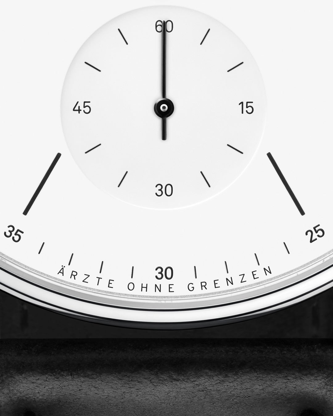 文字盤: ホワイトエナメル仕上げ、6時下に「Ärzte ohne Grenzen」の記述、12時赤インデックス