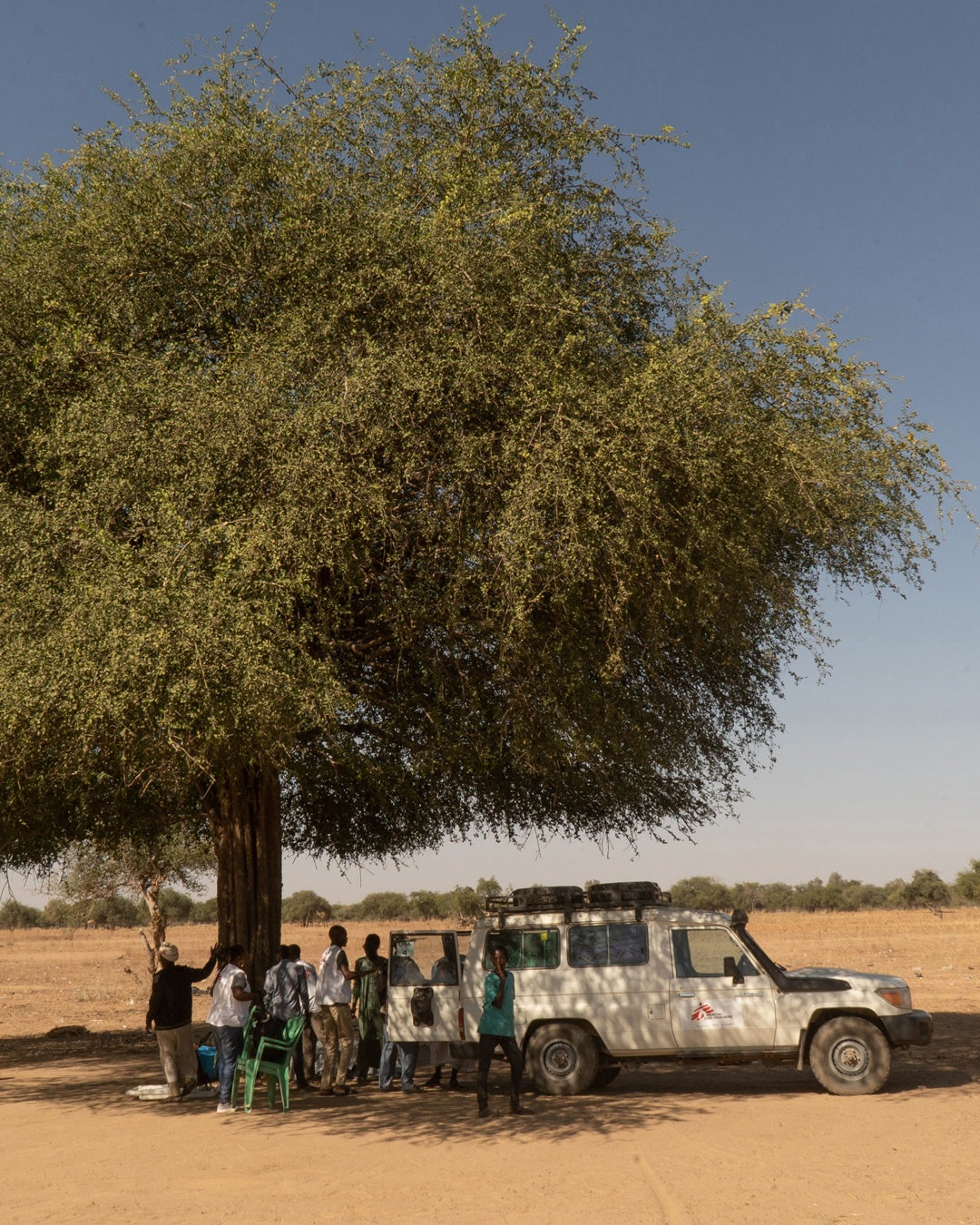 チャド東部で移動診療所を開設するための物資を搬入している国境なき医師団のチーム。