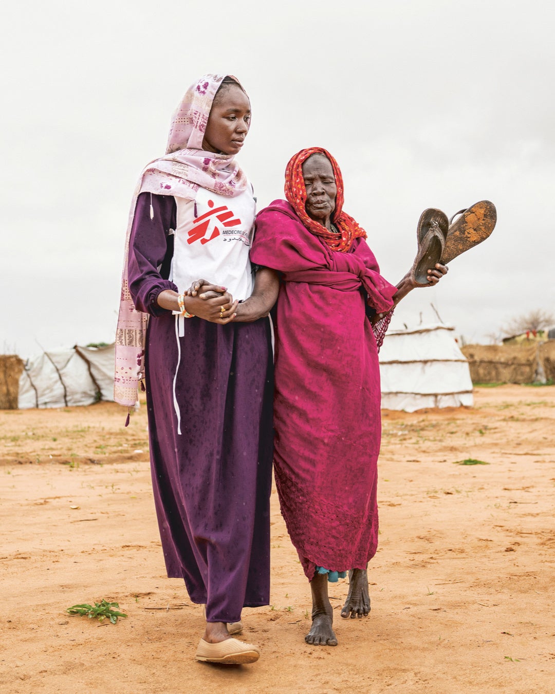 80歳のAisha G.をチャド東部にあるAdre IDPキャンプの国境なき医師団の診療所に連れて行く、ヘルスプロモーターのAishaB. (28歳)。