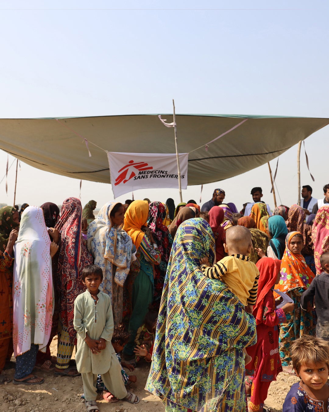 洪水被害にあったバローチスターン州東部のソーバトプル地区にある国境なき医師団の移動診療所。国境なき医師団のチームは、毎日900人以上の患者を診察している。