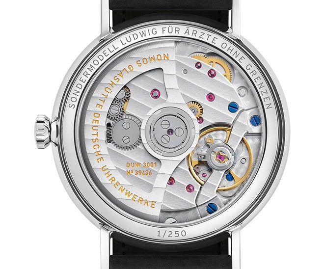 裏蓋の刻印の意味は「国境なき医師団のためのラドウィッグ特別モデル」です。この腕時計の2つのサ イズはそれぞれ限定250本のみ製造されます。