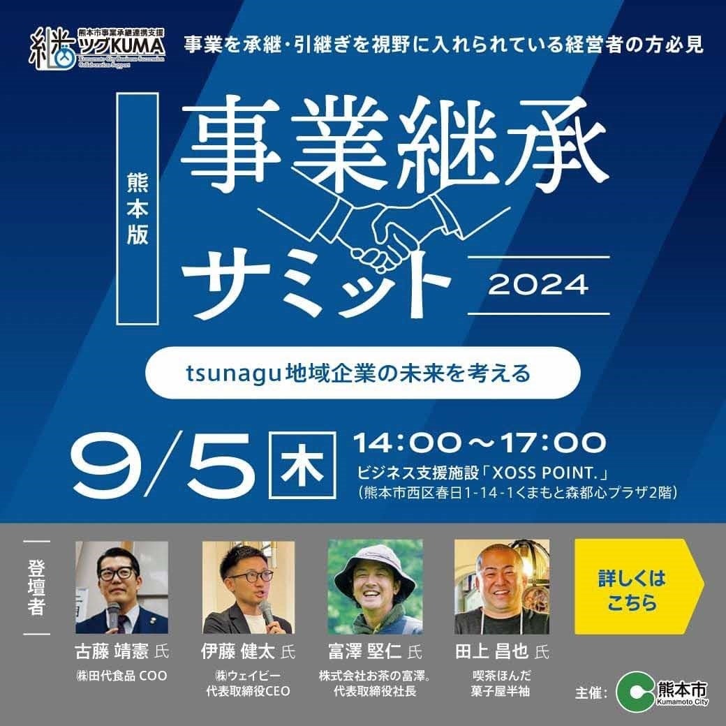 熊本市(市長:大西 一史)は、市内中小企業等の事業承継の推進に向けた取組として、9月5日(木)に「熊本版事業承継サミット2024」を開催することをお知らせいたします。
