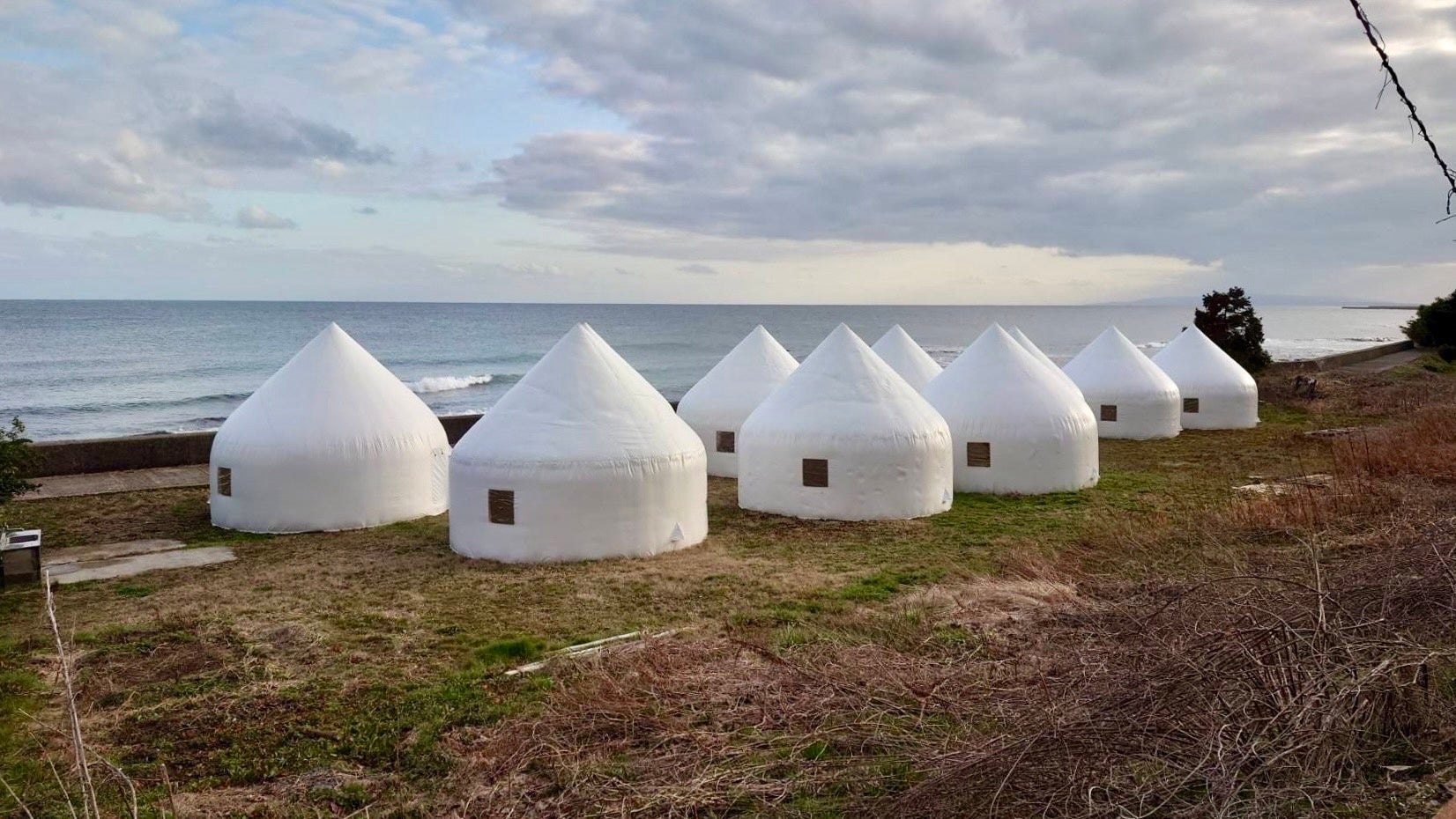 1. 気球のように空気膜を膨らます 2.膨らませたまま内側から断熱材を吹き付ける、のシンプルな工法の構築物です。それゆえ、形状や大きさも自由に選べて、質量が小さいことから、大人ひとりでも制作が簡便で、ひとつの建屋の工期は数時間と短く、屋内での断熱性や遮音性が高く、廉価性・簡便性・速度性・技術性・汎用性にも優れた構築物です。新しい多くの特徴をもつインスタントハウスは、名古屋工業大学の北川啓介教授が研究開発し、実際に令和6年能登半島地震の被災地全域へ約170棟が届けられました。被災地で実際に使用され、心のよりどころとなった「インスタントハウス」を用いて、復興祈願のためのチャリティ茶会を開催いたします。