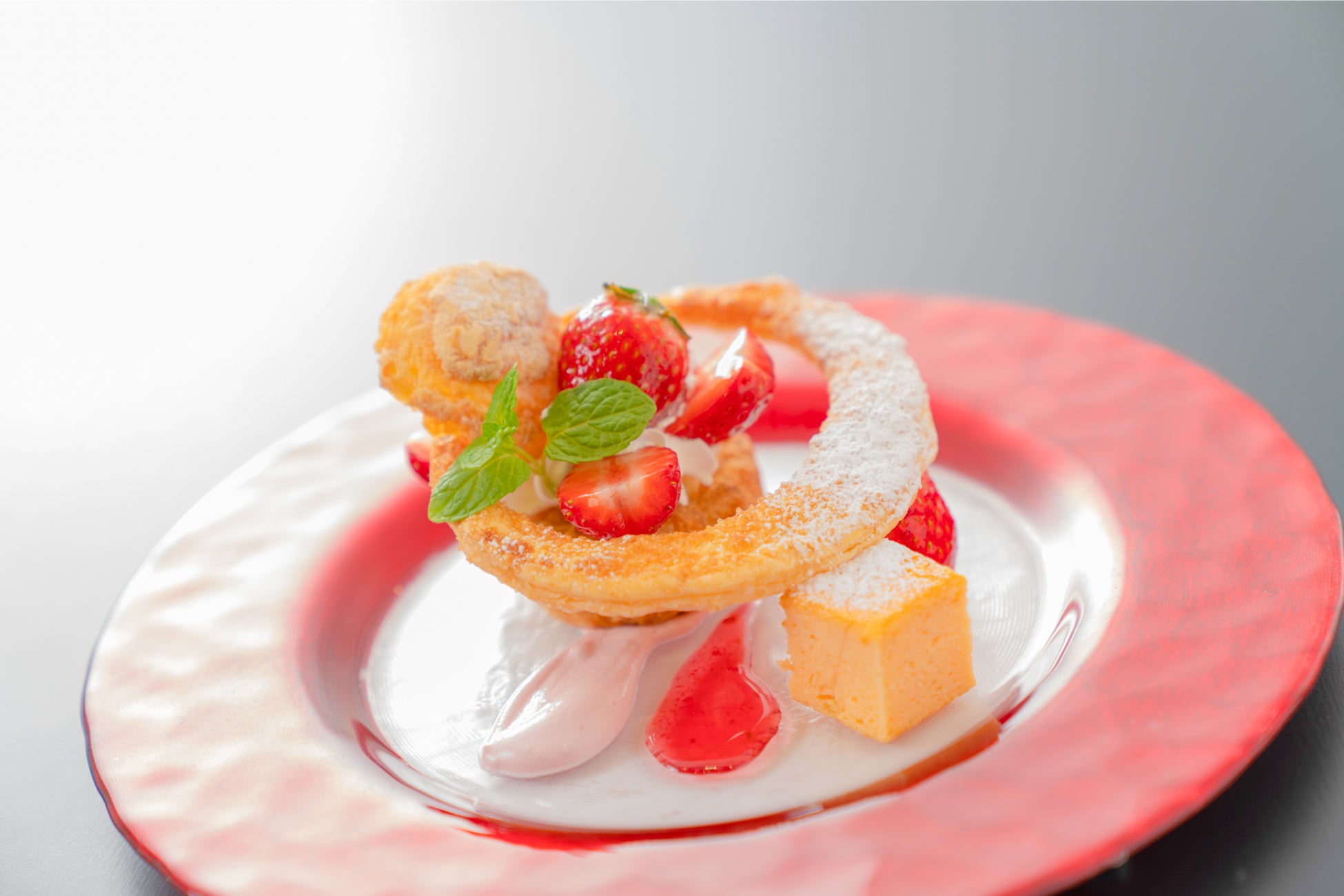そして、いちごと共に主役を飾るのは、蔵王産芽ぶきたまごを使用したチーズケーキ。蔵王高原の中で、太陽の光、高原の風を体いっぱいに浴び育ったたまごを使用することで濃厚な食感と風味が実現しました。