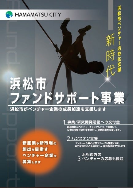 浜松市は、スタートアップ等に対して投資を行うベンチャーキャピタルおよびシードアクセラレータ等(以下「VC等」という。)の市内スタートアップ等に対する投資及び支援活動を促進し、またその知見および支援機能を活用しながら、スタートアップ等に対する事業化を支援するため、2021年度(令和3年度)「浜松市ファンドサポート事業」を実施しています。この度、浜松市がVC等と協調支援するスタートアップ等の募集を行います。