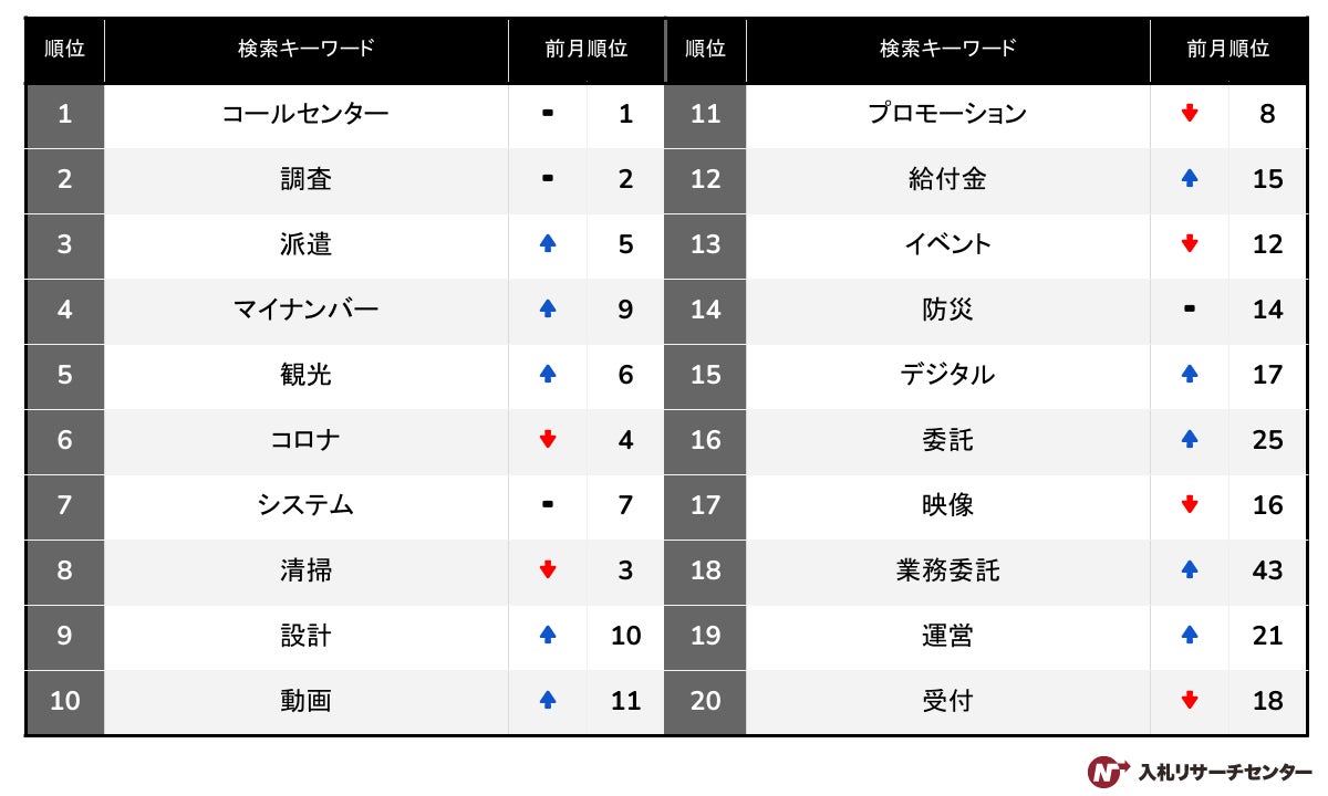 公示案件数・落札案件数ともに前年より増加検索キーワードは、前月に引き続き「コールセンター」が第1位に