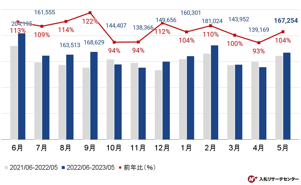 2023年5月の公示案件数の総計は167,254件で、前年比104%となりました。