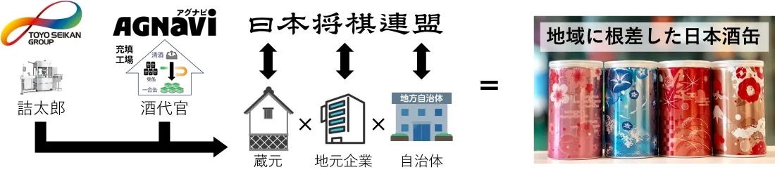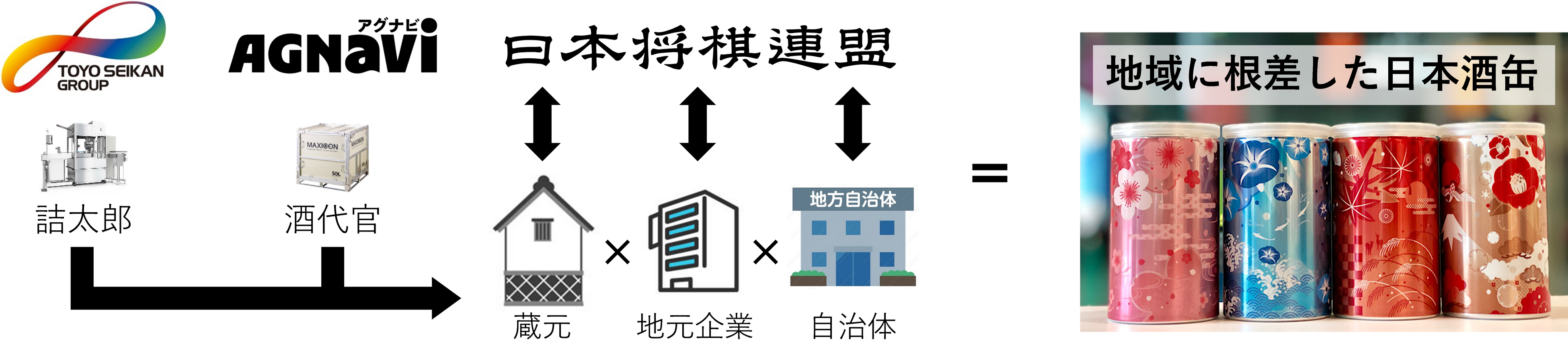 本プロジェクトは、各地域の酒蔵でつくった日本酒を一合サイズのアルミ缶に詰め、将棋の棋戦や地域におけるイベントを記念したオリジナル日本酒缶を製作することで、来場者および地域の方の交流の促進や、お土産として楽しんでいただくための充填サービスとなります。東洋製罐グループの保有する移動式日本酒缶充填サービス「詰太郎」を利用し、地場の蔵元に充填機をレンタルする方式、もしくはAgnaviの展開する委託充填サービス「酒代官」で、タンクに充填したお酒を送ることで缶に充填する方式をご利用いただけます。