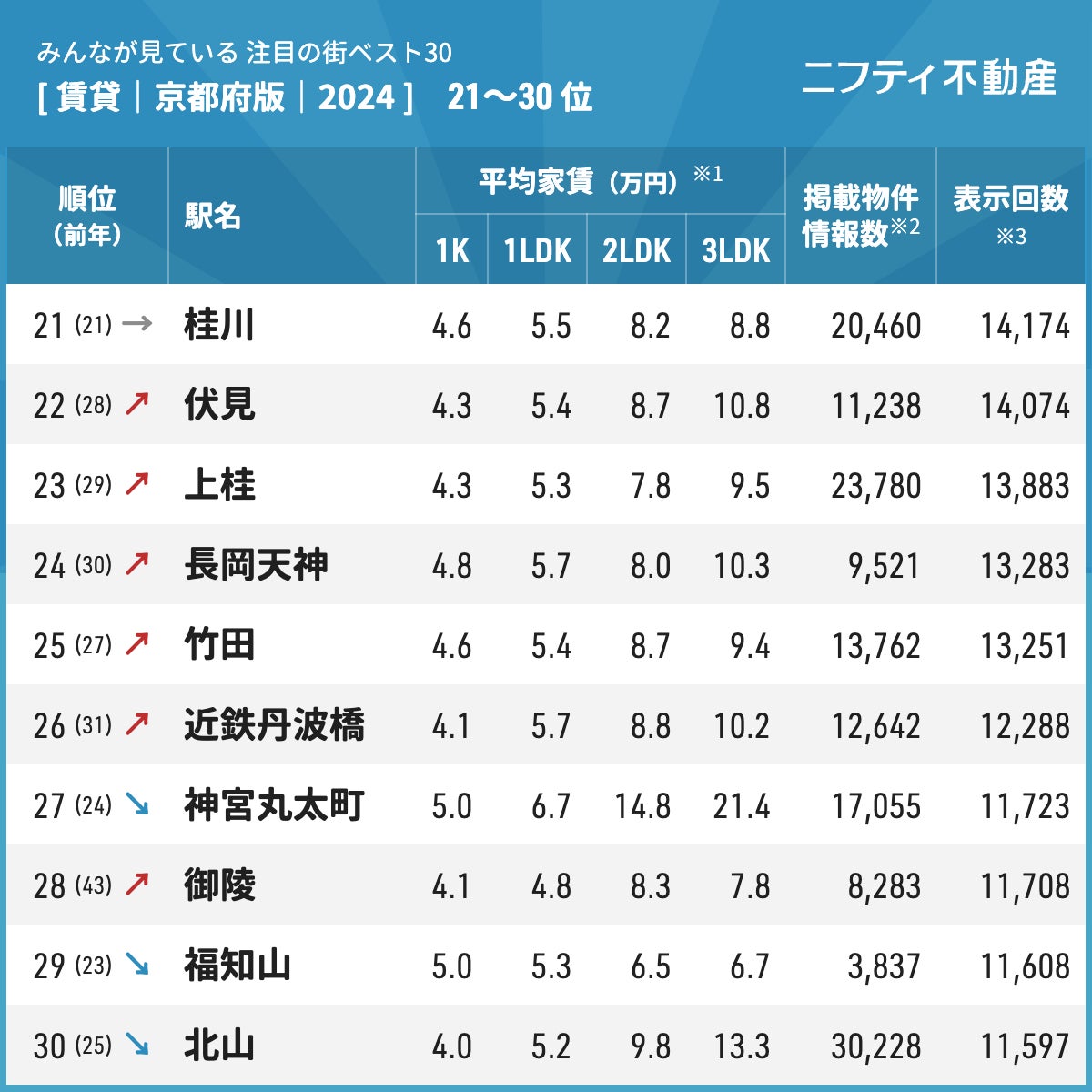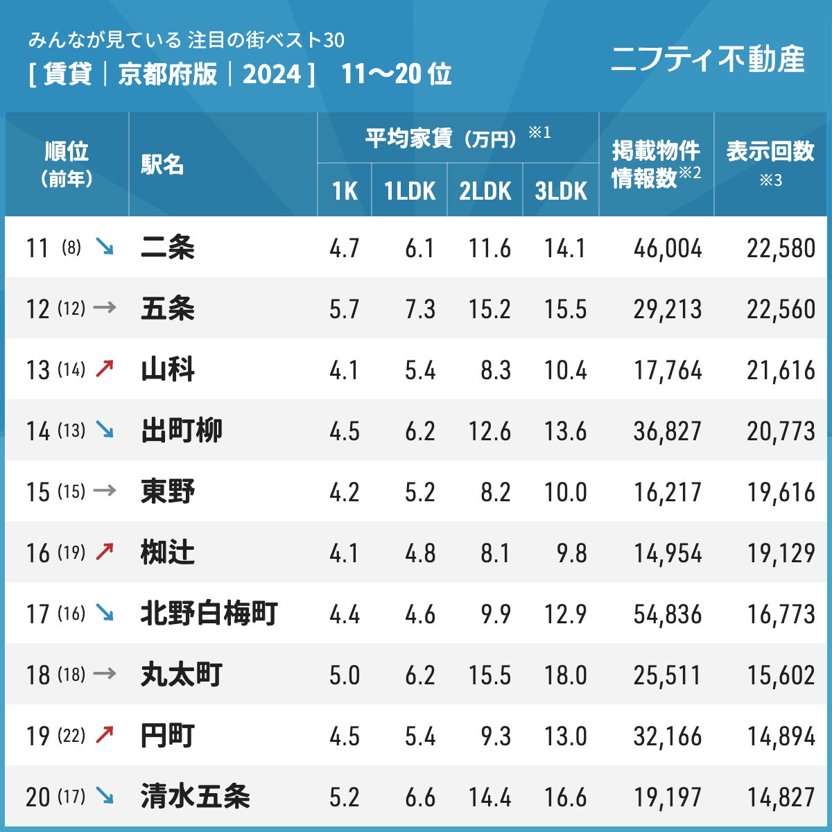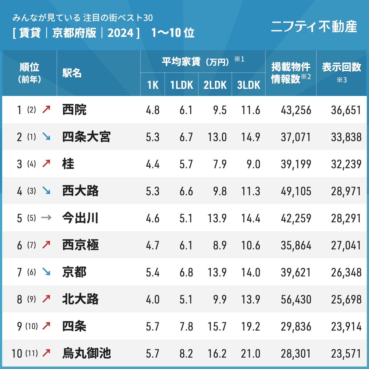 広域アクセス抜群の「西院」「四条大宮」が上位にランクイン!「京都の賃貸物件探しで注目の街ランキングベスト30」を発表(2024年調査)【ニフティ不動産】