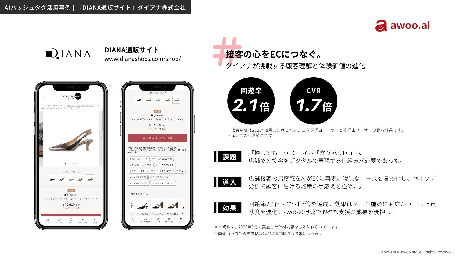 awoo株式会社(本社:東京都渋谷区、Japan Country Manager : 遠藤 光一、以下「awoo」)は、ダイアナ株式会社(本社:東京都千代田区、代表取締役会長 : 髙橋 郁夫、以下「ダイアナ」)の公式通販サイトにおけるAIマーケティングソリューション『awoo AI』の導入事例を公開しました。