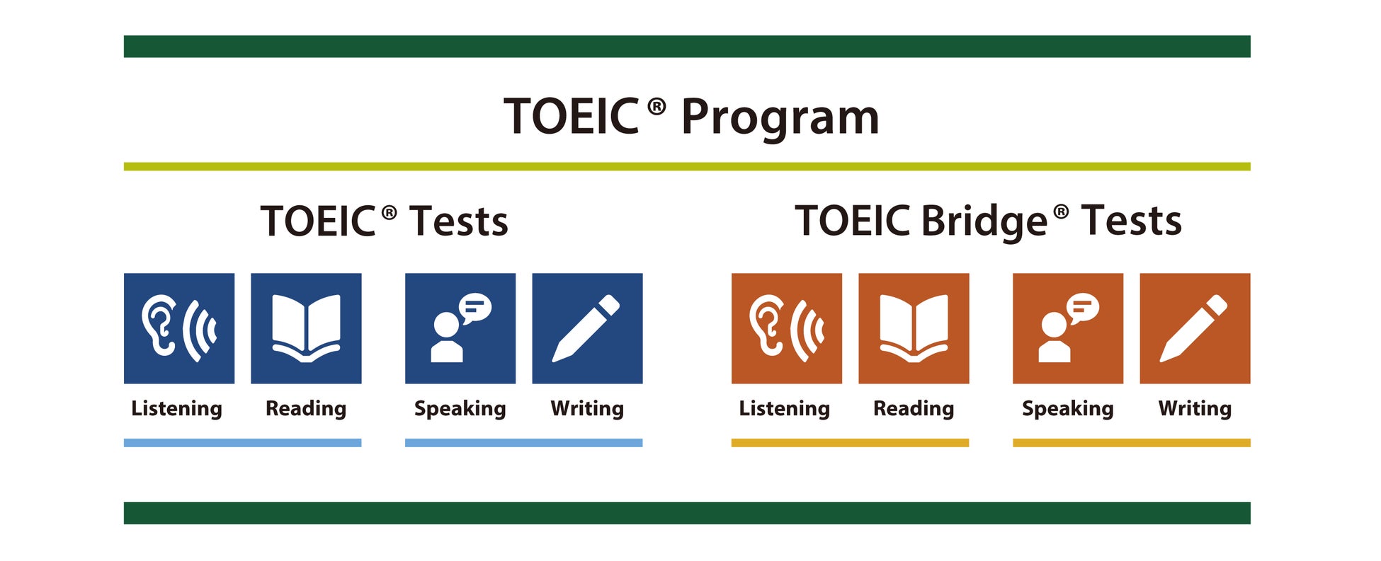 TOEIC® Listening & Reading Test、TOEIC® Speaking & Writing Tests、TOEIC Bridge® Listening & Reading Tests、TOEIC Bridge® Speaking & Writing Testsの総称。4つのテストを合わせたTOEIC® Programは世界160カ国、約14,000団体で実施されている。