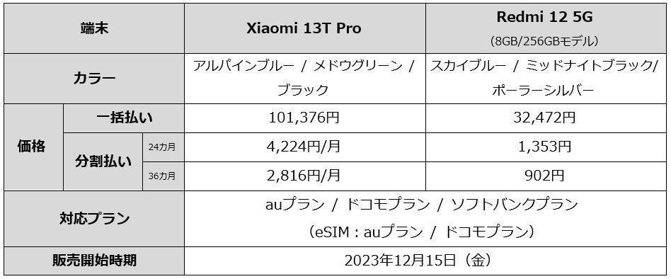 株式会社オプテージ(大阪市中央区)は、携帯電話サービス「mineo(マイネオ)」において、「Xiaomi 13T Pro」「Redmi 12 5G 8GB/256GBモデル」の販売を2023年12月15日(金)より開始いたします。