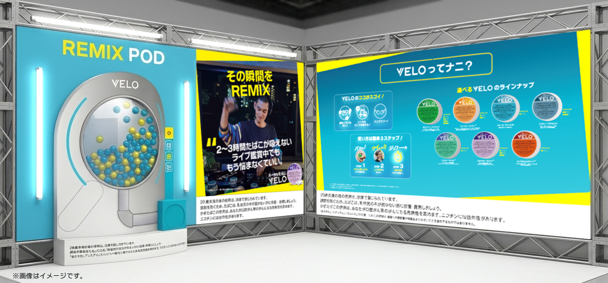 また、同ブースでは、VELOの最新キャンペーン「その瞬間をREMIX」をコンセプトにした「REMIX POD」も実施し、VELOを使いたくなる「MOMENT = 瞬間」にぴったりな景品をもれなくプレゼント※2 する施策も展開いたします。