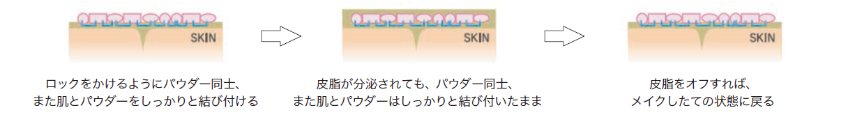 パウダー同士、また肌とパウダーの定着性を高め、皮脂が分泌されてもしっかりと結びついたまま離さず、化粧崩れを防ぎます。