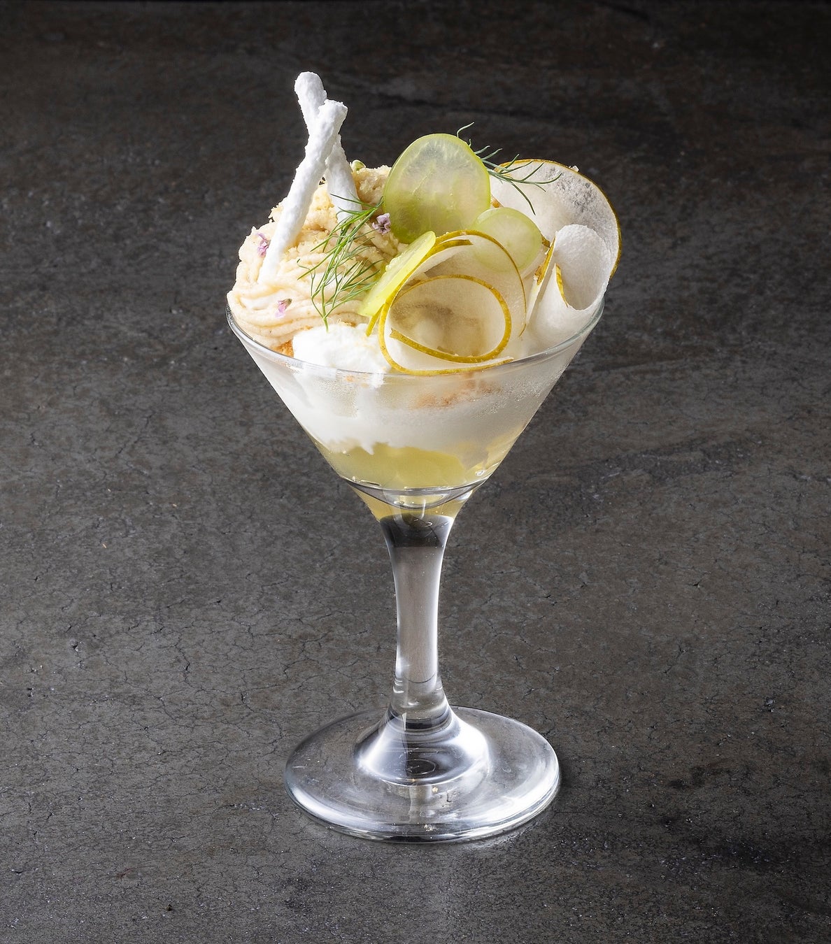 爽やかな緑茶のミントジュレ、角切りの和梨、自家製ハーブソルベ、クランブル、シャンティクリーム、甘味が豊かな和栗のクリームを重ね、和梨とシャインマスカットで飾ったエレガントなモンブランパフェです。秋味と食感を満喫できる極上パフェです。