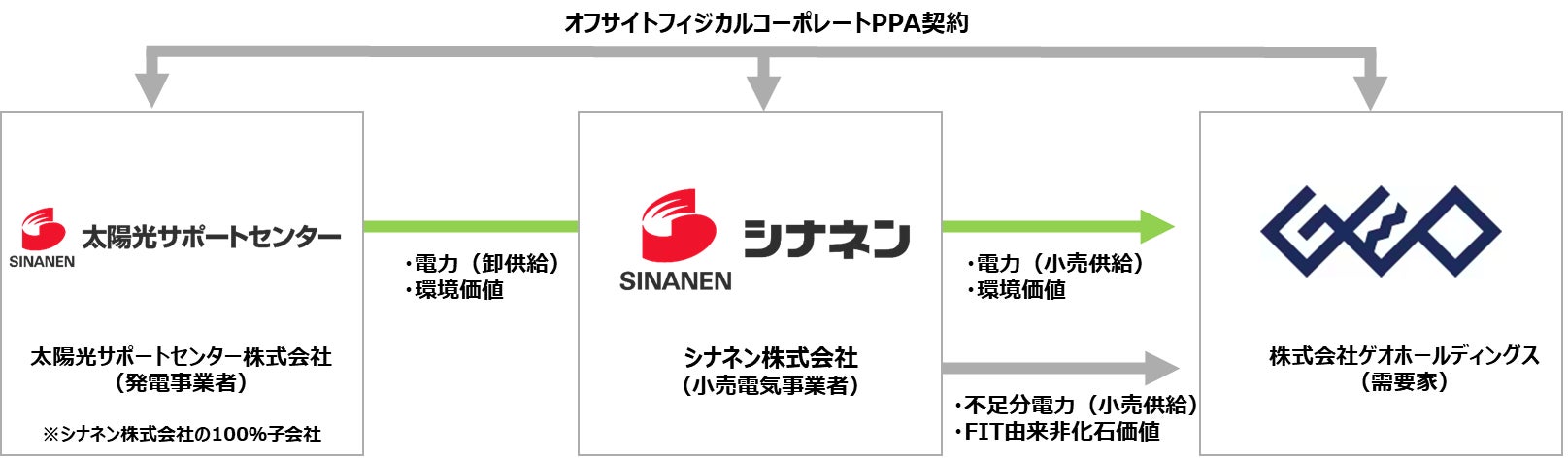 エネルギー・住まい・暮らしの総合サービス事業を提供するシナネンホールディングス株式会社(本社:東京都港区、代表取締役社長:山﨑 正毅)の子会社で、エネルギーソリューションを提供するシナネン株式会社(本社:東京都港区、代表取締役:渡邉 雅夫)は、オフサイトフィジカルコーポレート PPA※1(以下、本PPA)の仕組みを活用し、シナネンが新設した太陽光発電所から調達する再生可能エネルギー由来の生グリーン電力※2を、2024年5月1日から株式会社ゲオホールディングス(本社:愛知県名古屋市、代表取締役社長執行役員:遠藤 結蔵)の4店舗(「ゲオ春日井インター店」「セカンドストリート春日井インター店」「セカンドストリート高針原店」「セカンドストリート美濃加茂店」)へ供給することに合意いたしました。