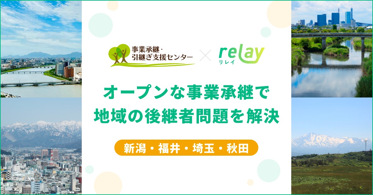 事業承継マッチングプラットフォーム「relay(リレイ)」が、中小企業庁によるオープンネーム事業承継の試行事業を受託。秋田・埼玉・新潟・福井の事業承継・引継ぎ支援センターとの連携を開始。