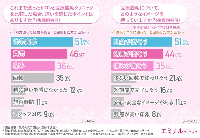 「これまで通ったサロンと医療脱毛クリニックを比較した場合、違いを感じたポイントはありますか?(複数回答可)」と質問したところ、『効果実感(51.7%)』『費用(46.9%)』『痛み(36.6%)』が上位になりました。