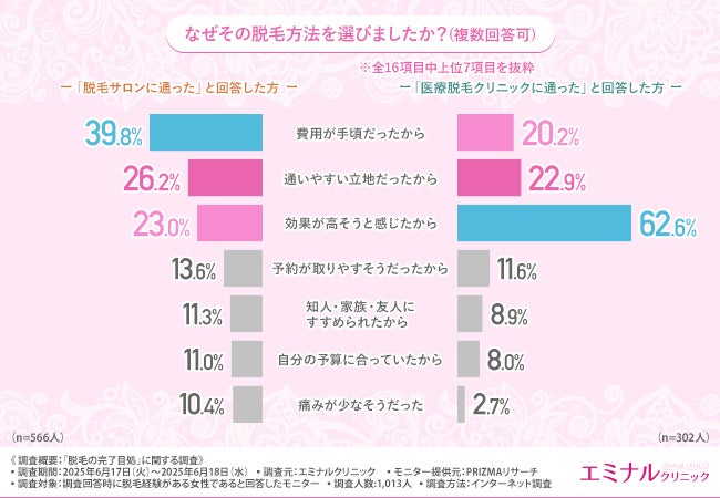 「なぜその脱毛方法を選びましたか?(複数回答可)」と質問したところ、脱毛サロンに通った方、医療脱毛クリニックに通った方で、以下のような回答結果になりました。