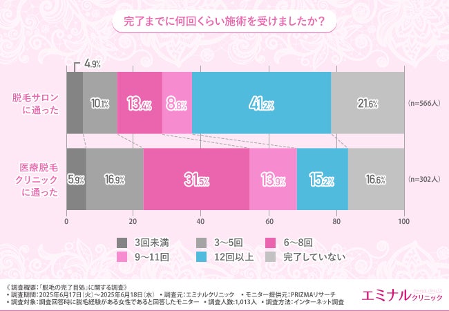 「完了までに何回くらい施術を受けましたか?」と質問したところ、脱毛サロンに通った方、医療脱毛クリニックに通った方で、以下のような回答結果になりました。