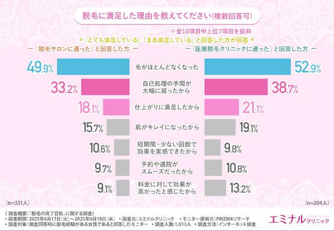『自己処理の手間が大幅に減ったから』『仕上がりに満足したから』という回答も上位になり、満足度を左右する最大の要因はやはり「効果そのもの」にあることが確認できます。