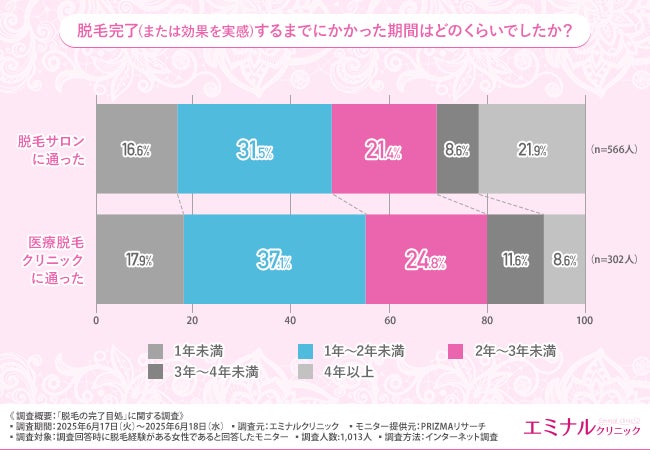 「脱毛完了(または効果を実感)するまでにかかった期間はどのくらいでしたか?」と質問したところ、脱毛サロンに通った方、医療脱毛クリニックに通った方で、以下のような回答結果になりました。