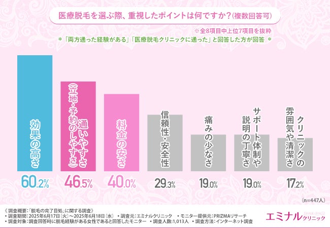 「医療脱毛を選ぶ際、重視したポイントは何ですか?(複数回答可)」と質問したところ、『効果の高さ(60.2%)』と回答した方が最も多く、『通いやすさ(立地・予約のしやすさ)(46.5%)』『料金の安さ(40.0%)』となりました。