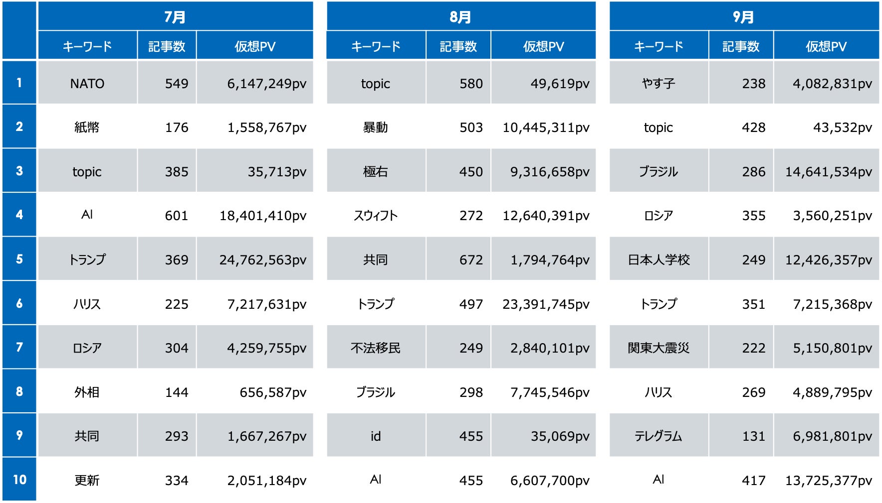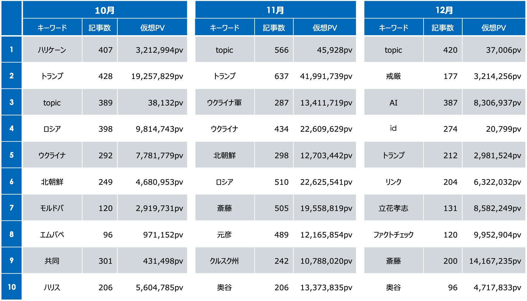 ニュースの数とPVは災害、SNS拡散は政治・歴史問題に反応。トレンドはトランプ氏と兵庫県知事選挙が強力。