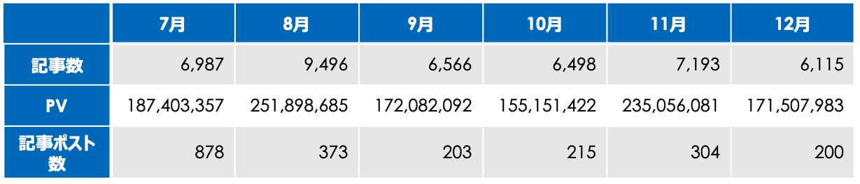 記事数・PVは8月が最多、11月が2位。Xでの記事ポストは7月が最多。