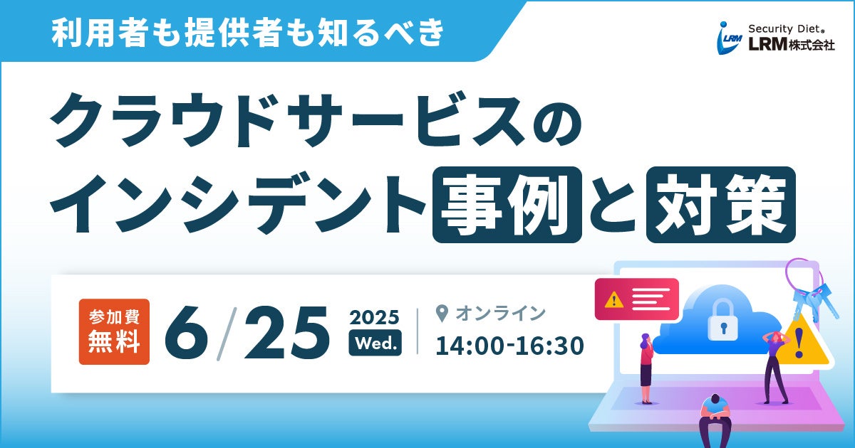 LRM株式会社(本社:兵庫県神戸市、代表取締役CEO:幸松哲也)、グローバルセキュリティエキスパート株式会社(本社:東京都港区、代表取締役社長:青柳史郎)、丸紅I-DIGIOホールディングス株式会社(本社:東京都文京区、代表取締役社長:佐藤由浩)、ファイルフォース株式会社(本社:東京千代田区、代表取締役:サルキシャン アラム)は、2025年6月25日(水)14時から、実際のインシデント事例を紹介しながら、安全にクラウドを活用するための効果的なセキュリティ強化策を解説するセミナーを無料開催します。Zoomでお気軽にご視聴いただけますので、ぜひご参加ください。