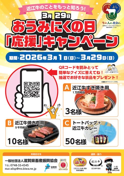 このたび、滋賀の畜産振興を担う当協会において、近江牛の魅力を消費者の皆さまに知っていただき、美味しい近江牛をもっと食べていただけるように「おうみにくの日」を「応援」するキャンペーンを実施することとしました。