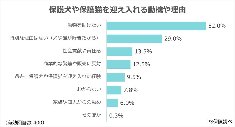 ・保護犬や保護猫を迎え入れる動機は、「動物を助けたい」が最多の52.0%。