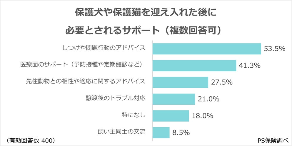 「しつけや問題行動のアドバイス」(53.5%)が最多で、飼い主の半数以上が保護犬や保護猫の行動面でのサポートを強く求めていることがわかりました。次いで、「医療面のサポート(予防接種や定期健診など)」(41.3%)が挙げられ、健康管理の重要性も高く認識されています。