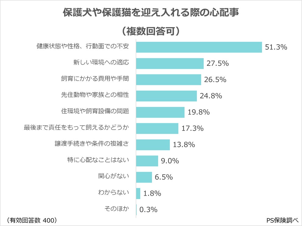 ・保護犬や保護猫の迎え入れに際し、51.3%が「健康状態や性格、行動面での不安」と回答。